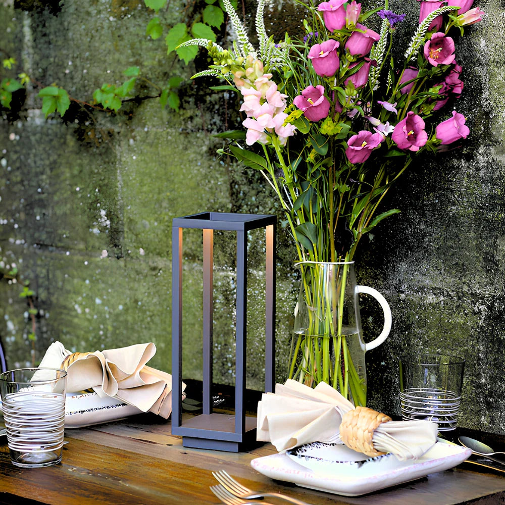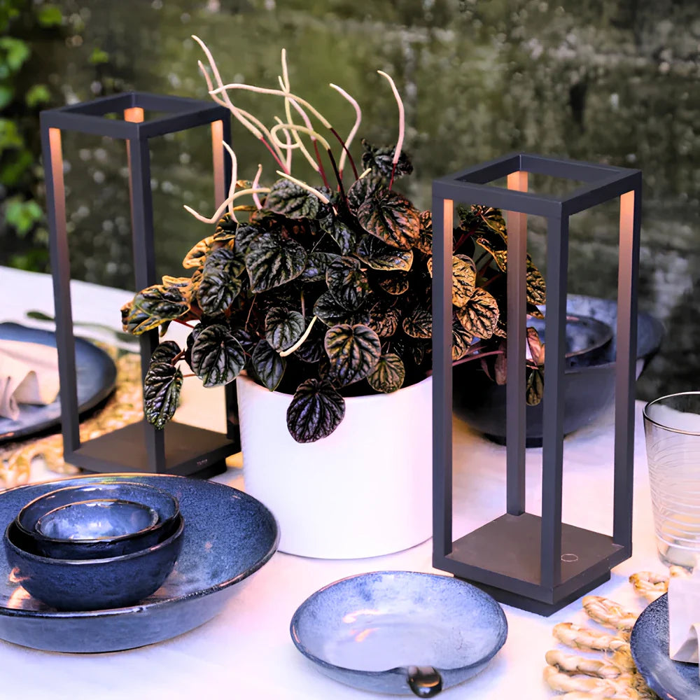 Sleek and sculptural. the LumaFrame™ Lantern delivers a modern glow for refined spaces. Inspired by classic lantern forms and crafted from aluminum alloy. its open-frame design casts a soft. customizable light perfect for patio dinners. cozy reading corners. or stylish gatherings. With cordless convenience. dimmable brightness. and a long-lasting battery. it's both beautiful and practical.