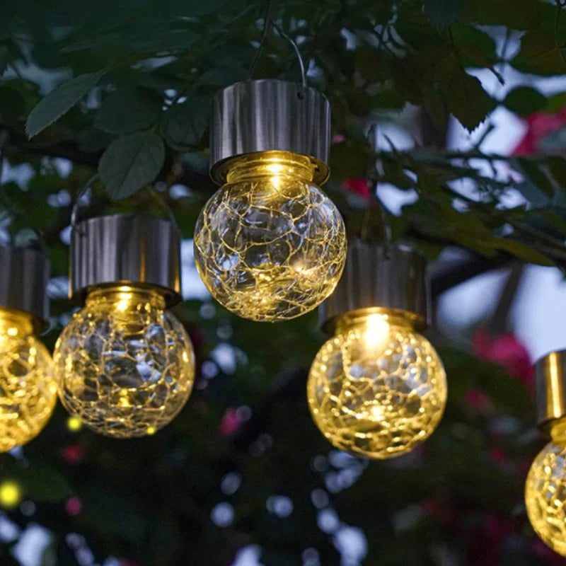 Add rustic charm to your evenings with the SolarLoom™ Lantern. Crafted with crackle glass and a natural rope handle. it hangs effortlessly from branches or rests gracefully on tables and paths. As dusk falls. it automatically lights up. casting a shimmering. starry glow that enhances any outdoor setting with cozy elegance. Weather-resistant and cordless. it's made to bring effortless beauty to your nights. again and again.